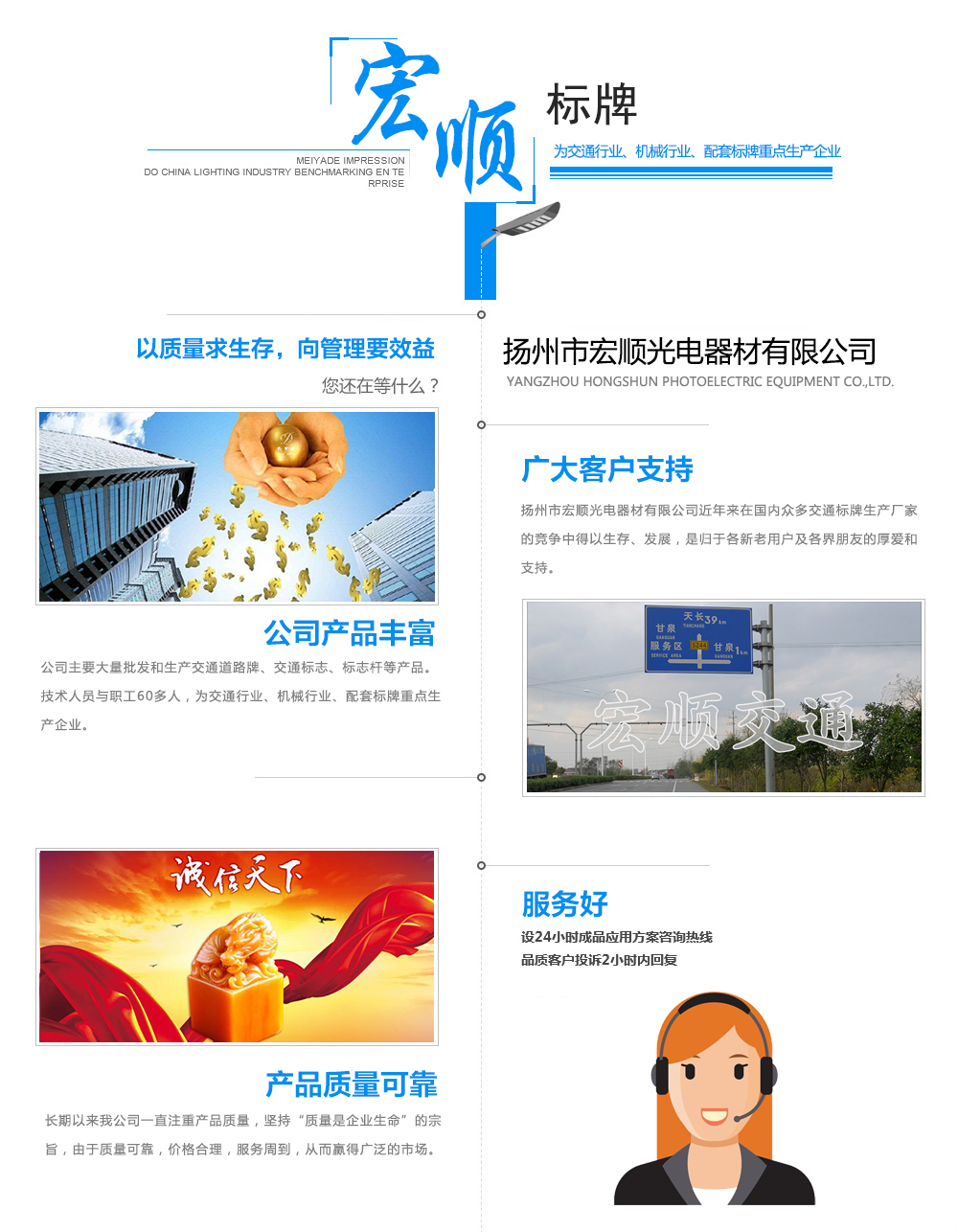 揚州市宏順光電器材有限公司近年來在國內眾多交通標牌生產(chǎn)廠家的競爭中得以生存、發(fā)展,是歸于各新老用戶及各界朋友的厚愛和支持。我們全體員工向你們致以誠摯的感謝。 為使我們共同步入新世紀,提高我們的產(chǎn)品質量與服務希望對我們提出寶貴的意見,使我們不斷改進、創(chuàng)新。 我們將和過去一樣,視今天的質量為明天的市場。為您奉獻滿意的各種精品,為美化我們的交通事業(yè)做出貢獻。 公司主要大量批發(fā)和生產(chǎn)道路交通標志牌、道路指示牌、交通標志牌、指路牌、反光標志牌等產(chǎn)品。技術人員與職工60多人,為交通行業(yè)、機械行業(yè)、配套標牌重點生產(chǎn)企業(yè)。 長期以來我公司一直注重產(chǎn)品質量,堅持“質量是企業(yè)生命”的宗旨,由于質量可靠,價格合理,服務周到,從而贏得廣泛的市場,近年來隨著交通事業(yè)的開發(fā)和研究,傾聽用戶的意見,使得我們在市場競爭中不斷發(fā)展壯大。 我們本著“質量可靠、信譽優(yōu)先、用戶至上”的宗旨,“以質量求生存,向管理要效益”的信條,竭誠為... ...【查看更多】